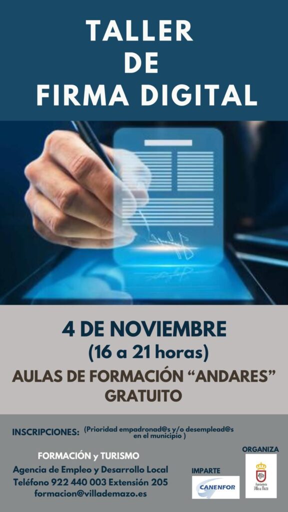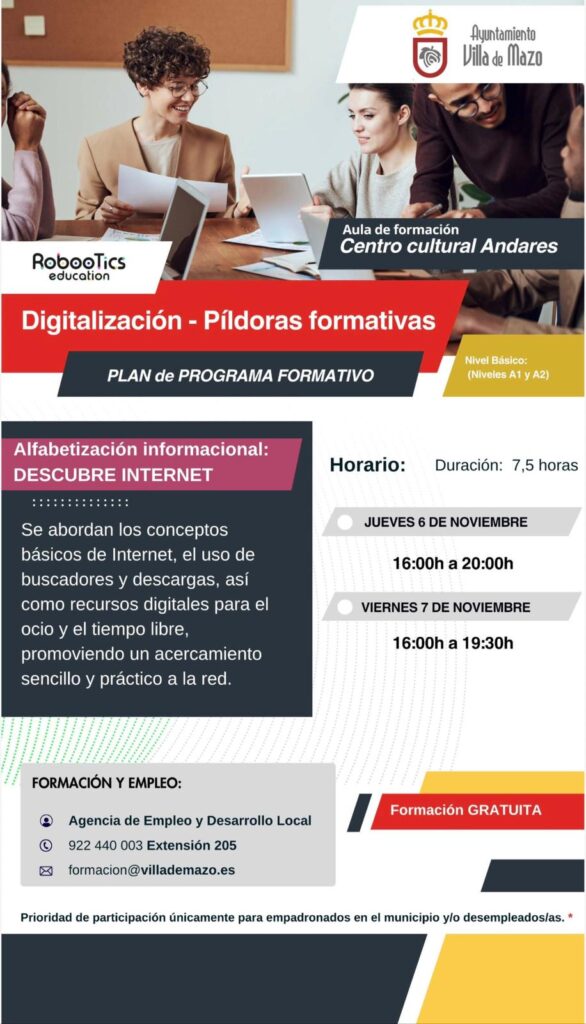 El Ayuntamiento de Villa de Mazo impulsa las competencias digitales de la ciudadanía con un nuevo módulo de píldoras formativas que se desarrollará el martes 4 y miércoles 5, en horario de 16:00 a 21:00 horas, el jueves 6, de 16:00 a 20:00 y el viernes 7 de noviembre, de 16:00 a 19:30 horas, en el Centro Cultural Andares.