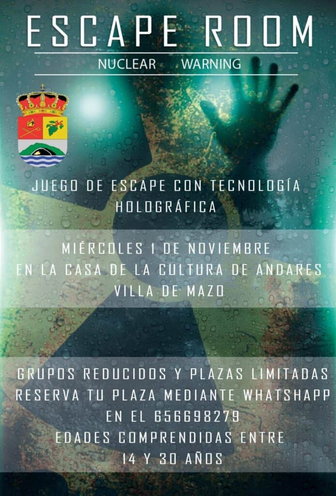 El Ayuntamiento de Villa de Mazo pone en marcha la celebración del ‘Escape Room Nuclear Warning’, un juego que tiene como objetivo escapar de un determinado espacio a través de pistas y mediante la cooperación en equipo. El evento tendrá lugar el miércoles, 1 de noviembre, en la Casa de la Cultura de Andares.