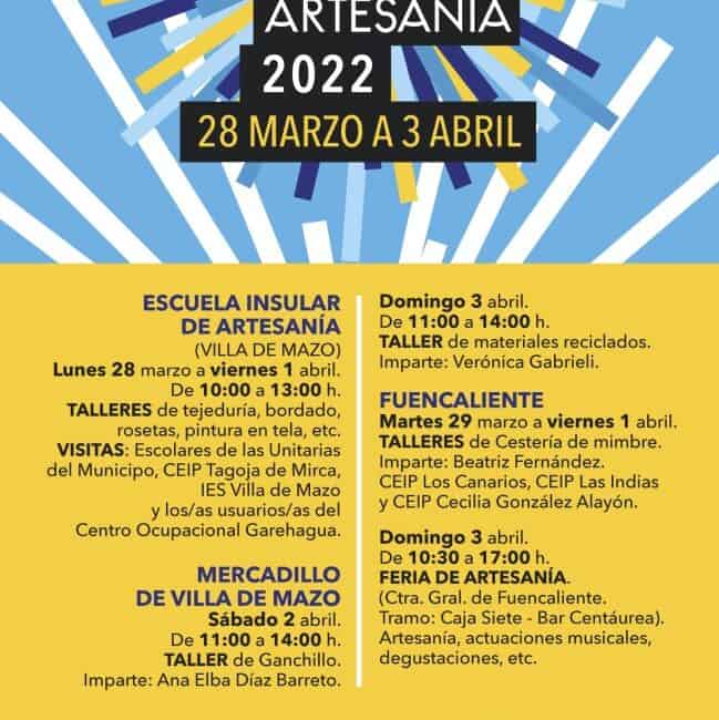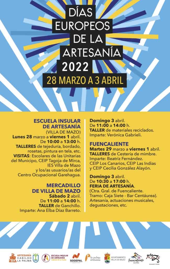 El Área de Artesanía del Cabildo de La Palma, que dirige Susana Machín, celebra los Días Europeos de la Artesanía, que son del 28 de marzo al 3 de abril, con el desarrollo de talleres y ferias en los municipios de Villa de Mazo y Fuencaliente. El programa de actividades se desarrolla en colaboración con La Palma Artesanía, de la empresa pública Sodepal, los ayuntamientos de Villa de Mazo y Fuencaliente y la asociación Arte Mazo.