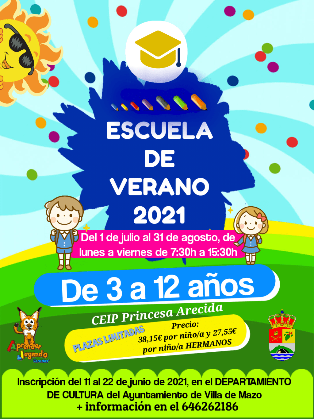 El Ayuntamiento de Villa de Mazo abre el plazo de inscripción de la Escuela de Verano 2021 para niños y niñas de 3 a 12 años empadronados en el municipio, para los meses de julio y agosto, en horario de 7:30 h a 15:30 h, en las instalaciones del CEIP Princesa Arecida.