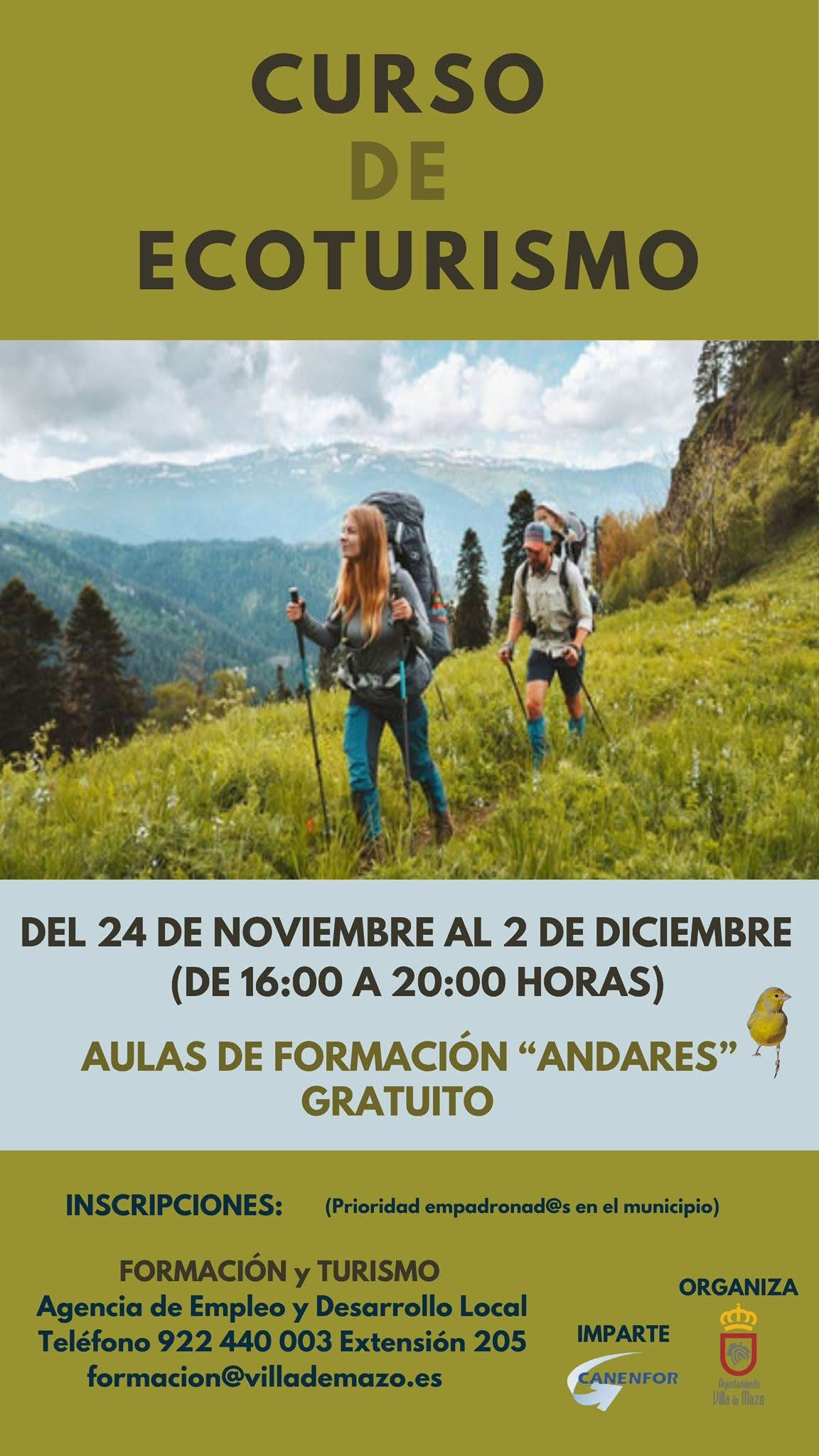 La Concejalía de Formación y Turismo organiza el Curso de Ecoturismo, una formación gratuita impartida por CANENFOR. El curso se llevará a cabo del 24 de noviembre al 2 de diciembre, en horario de 16:00 a 20:00 horas, en las Aulas de Formación "Andares". Se dará prioridad a la inscripción de personas empadronadas en el […]