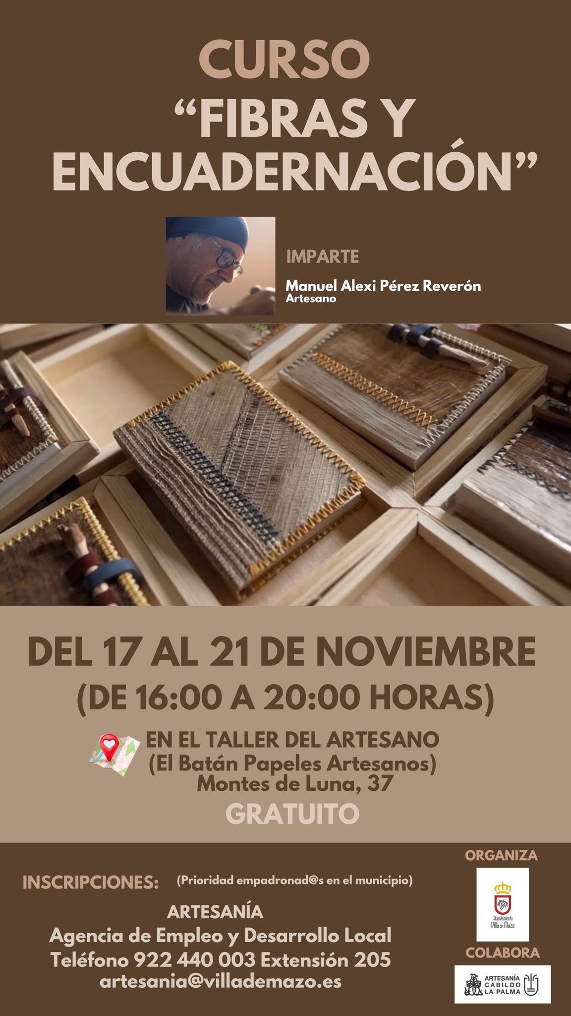 ¡Aprende el arte tradicional de la encuadernación con expertos! El Ayuntamiento de Villa de Mazo, en colaboración con Artesanía La Palma, te invita a participar en el Curso Gratuito de Fibras y Encuadernación, una oportunidad única para acercarte a este oficio artesanal. De la mano del reconocido artesano Manuel Alexi Pérez Reverón, los participantes aprenderán […]