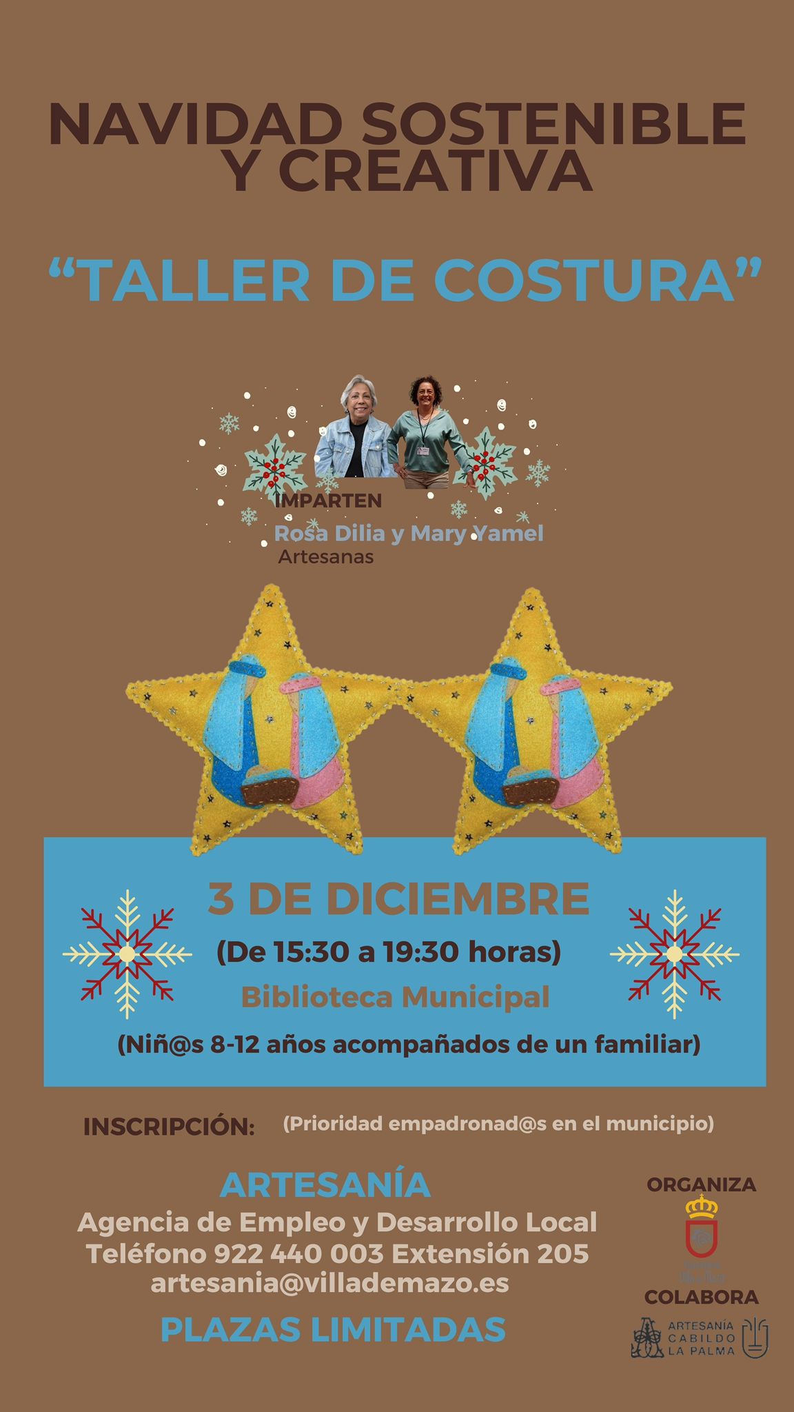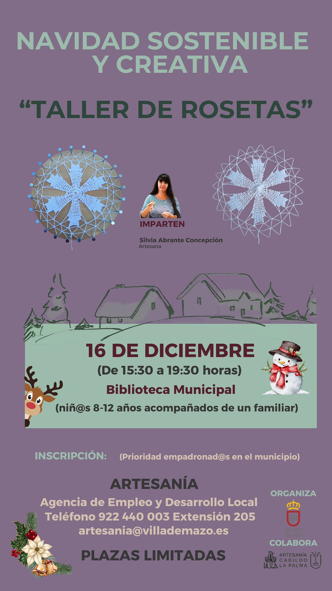 Dentro del proyecto "Talleres de Navidad Sostenible y Creativa". Se llevará a cabo el 9 de Diciembre de 15:30 a 19:30 horas en la Biblioteca Municipal. Este taller está dirigido a adultos y será impartido por Rosa Dilia Marrero Blanco, Artesana, centrándose en la creación de adornos navideños con tela. La inscripción se realiza a […]