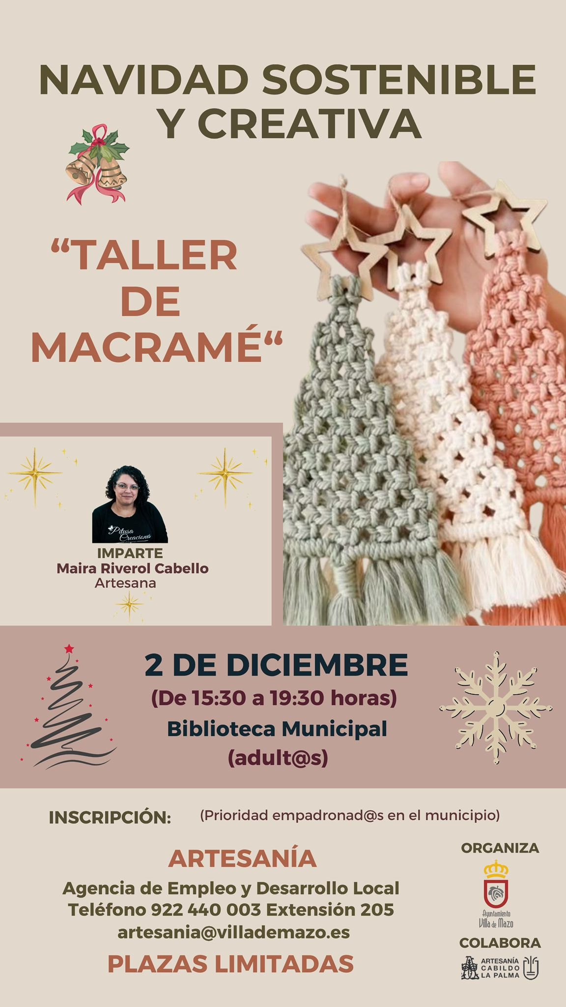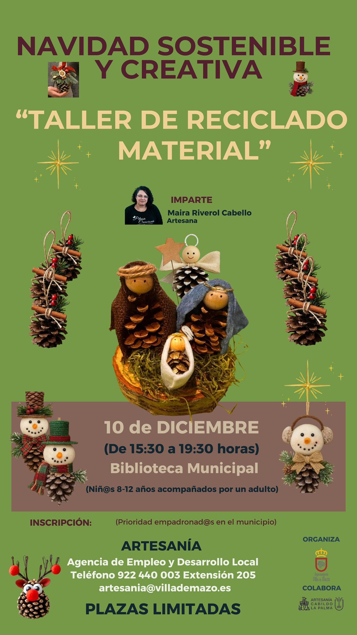 Como parte de la iniciativa "Navidad Sostenible y Creativa", se presenta el "Taller de Muñequería". Esta actividad gratuita tendrá lugar el 26 de noviembre, de 15:30 a 19:30 horas, en la Biblioteca Municipal. El taller será impartido por la artesana Maira Riverol Cabello. Las inscripciones son limitadas, con prioridad para empadronados en Villa de Mazo, […]