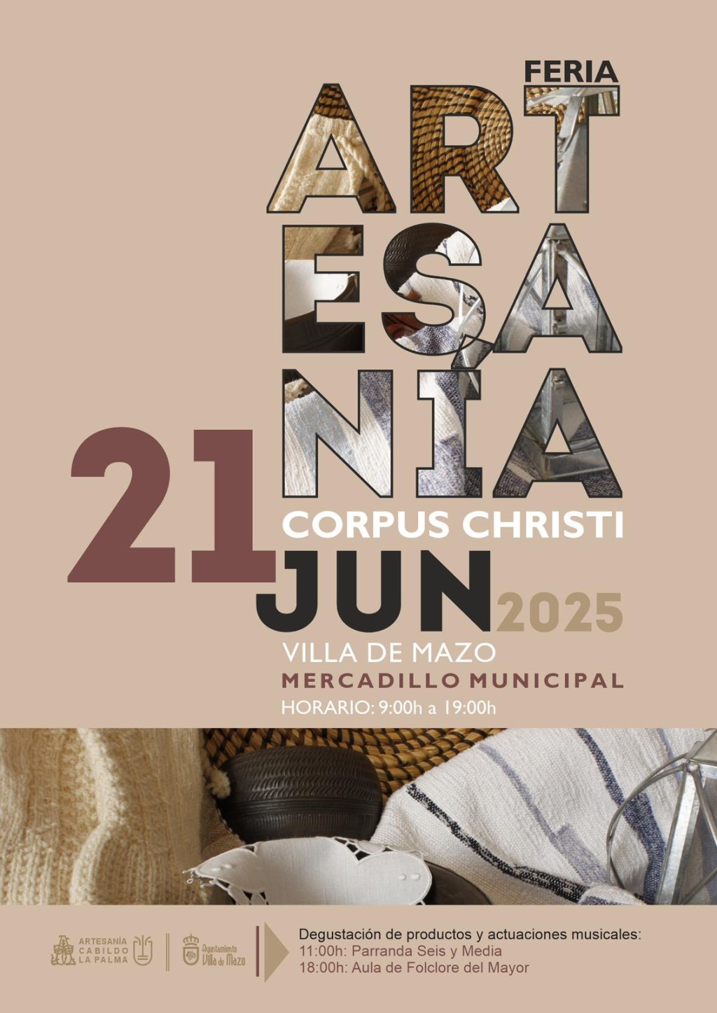 El próximo 21 de junio de 2025 se celebrará la Feria de Artesanía con motivo del Corpus Christi en Villa de Mazo, en el Mercadillo Municipal. Muestra artesanal de los distintos oficios artesanos: - Trajes Tradicionales - Almazuelas - Muñequería - Macramé - Marroquinería - Bordado Tradicional - Modelado - Encajes - Ganchillo - Reciclado […]