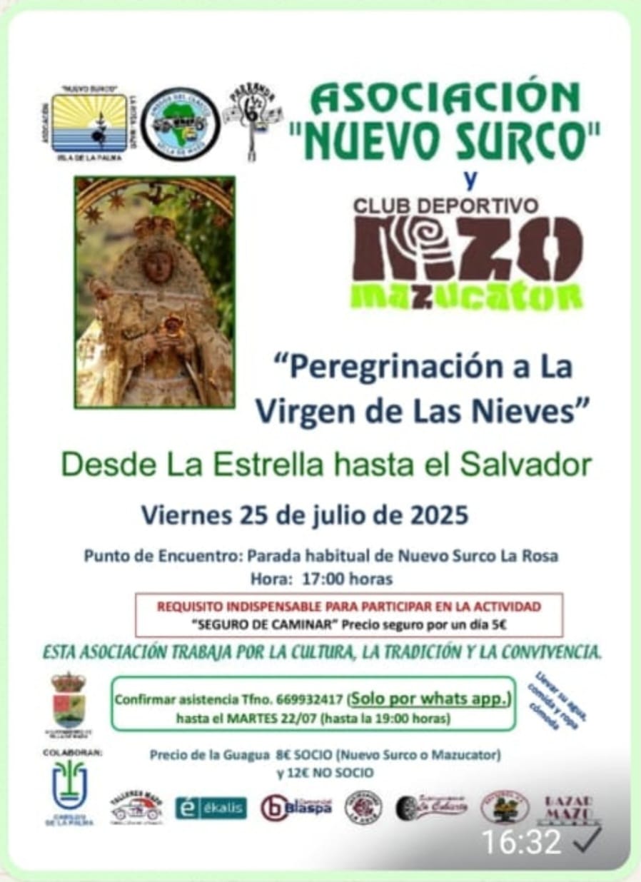 La Asociación "Nuevo Surco" y el Club Deportivo Mazo Mazucator te invitan a participar en esta caminata especial en honor a la Virgen de Las Nieves