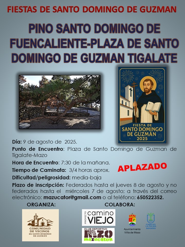 APLAZADO por Riesgos Incendios Forestales. Con motivo de las fiestas en honor a Santo Domingo de Guzmán, se organiza una caminata desde el Pino Santo Domingo de Fuencaliente hasta la Plaza de Santo Domingo de Guzmán en Tigalate-Mazo. Fecha: 9 de agosto de 2025 Punto de encuentro: Plaza de Santo Domingo de Guzmán, Tigalate-Mazo Hora […]