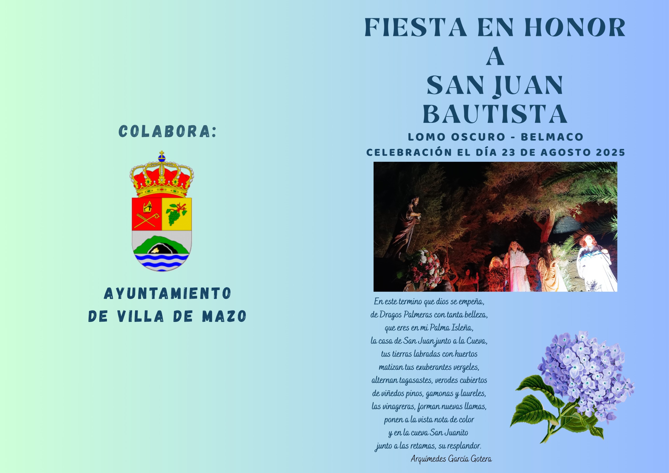 🎉 MAZO BAILA al son de los 70 y 80 🎶 👉 Domingo 22 de junio📍 Plaza del Corpus, Villa de Mazo🕐 A partir de las 13:00 h Disfruta de una jornada llena de música y baile en el marco de las Fiestas del Corpus Christi 2025.Con las actuaciones de: 🎸 Grupo Guateque🎤 Pepe Benavente🎙️ […]