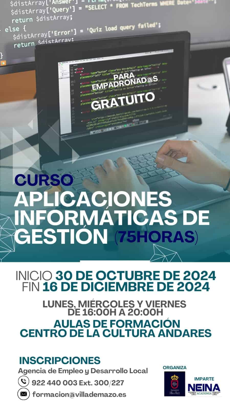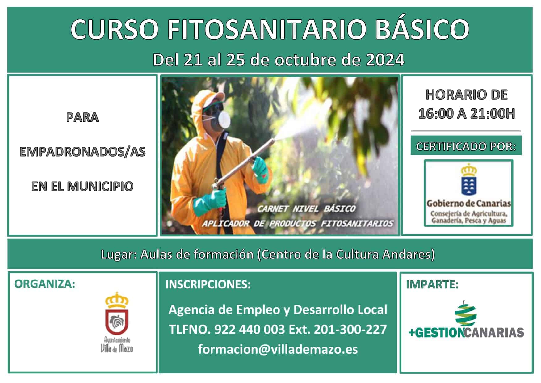 Del 21 al 25 de octubre de 2024. De 16 a 21 horas Para personas empadronadas en el municipio. Aulas de formación del Centro de la Cultura Andares. Inscripciones en Agencia de Empleo y Desarrollo Local. Telef. 922 440 003 Ext. 201-300-227 Email: formacion@villademazo.es