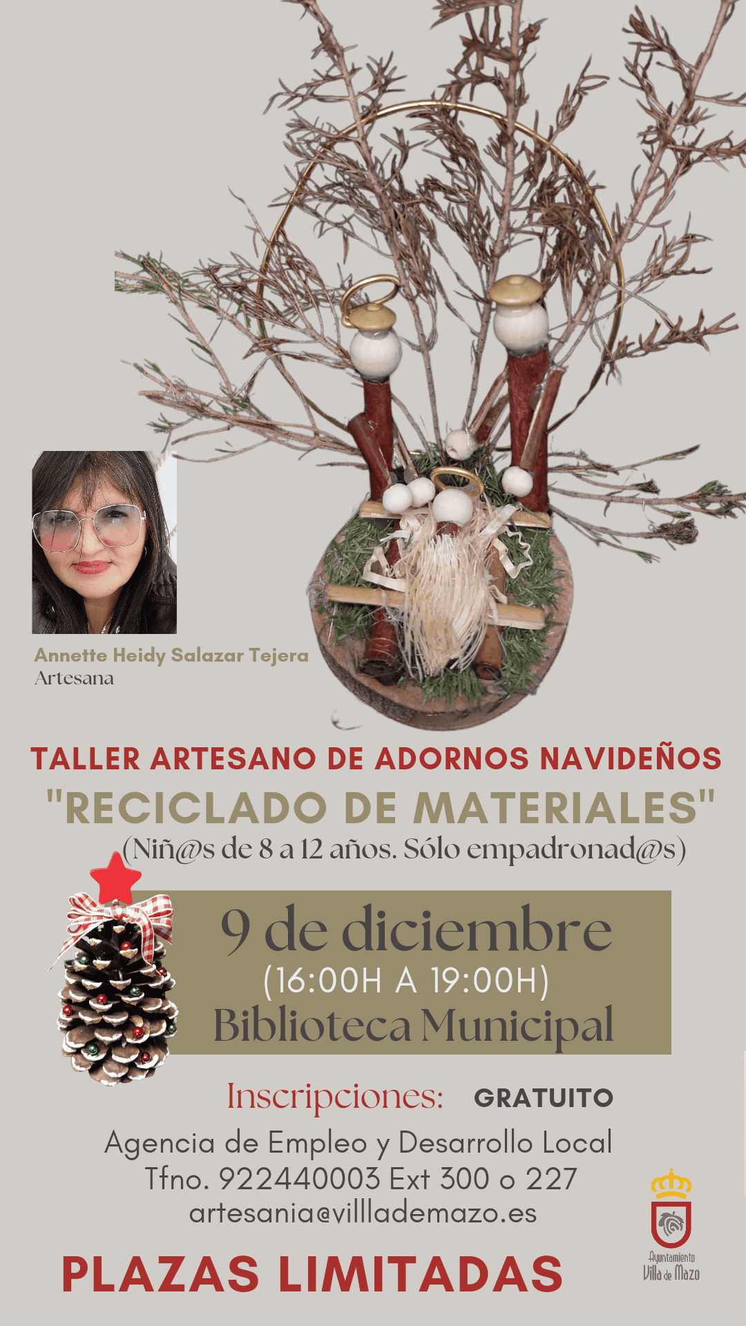 CURSO de "MARROQUINERÍA", imparte el artesano JUAN MANUEL SIMÓN PÉREZ. Del 4 al 29 de noviembre De lunes a viernes De 16:00h a 21:00h Mercadillo Municipal (parte alta) INSCRIPCIONES y INFORMACIÓN Agencia de Empleo y Desarrollo Local 922 440 003 Extensiones 300-227 artesania@villademazo.es GRATUITO PLAZAS LIMITADAS