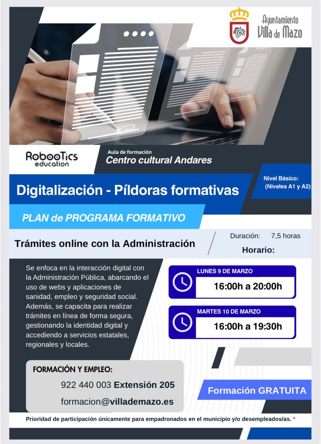 Para más detalles o para inscribirte, puedes contactar con el área de Formación y Empleo: