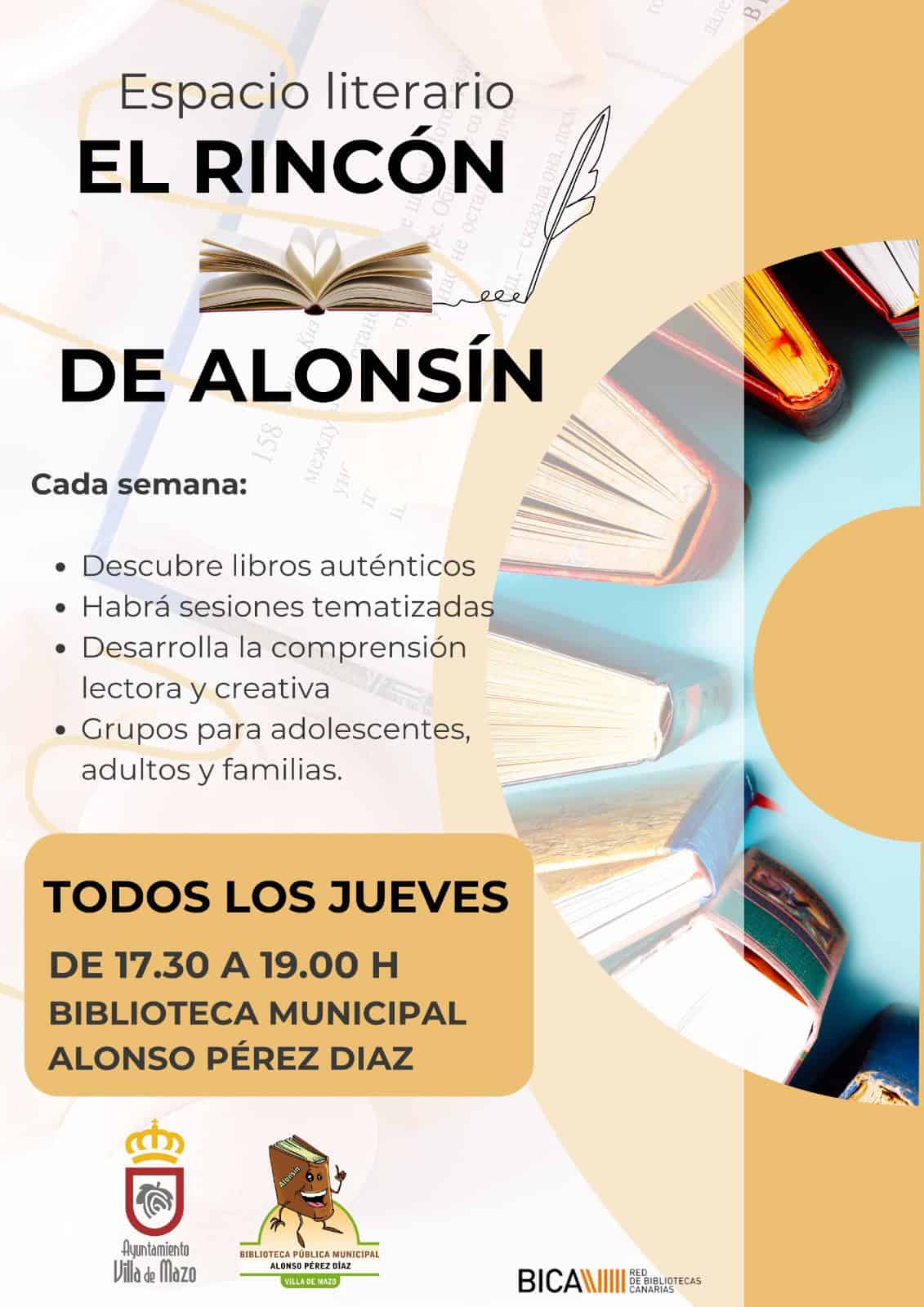 A partir del mes de noviembre damos inicio al Espacio Literario “El Rincón de Alonsín” dirigido para adolescentes, adultos y familias a través del planteamiento de diversas sesiones semanales que tendrán lugar en nuestra biblioteca municipal: