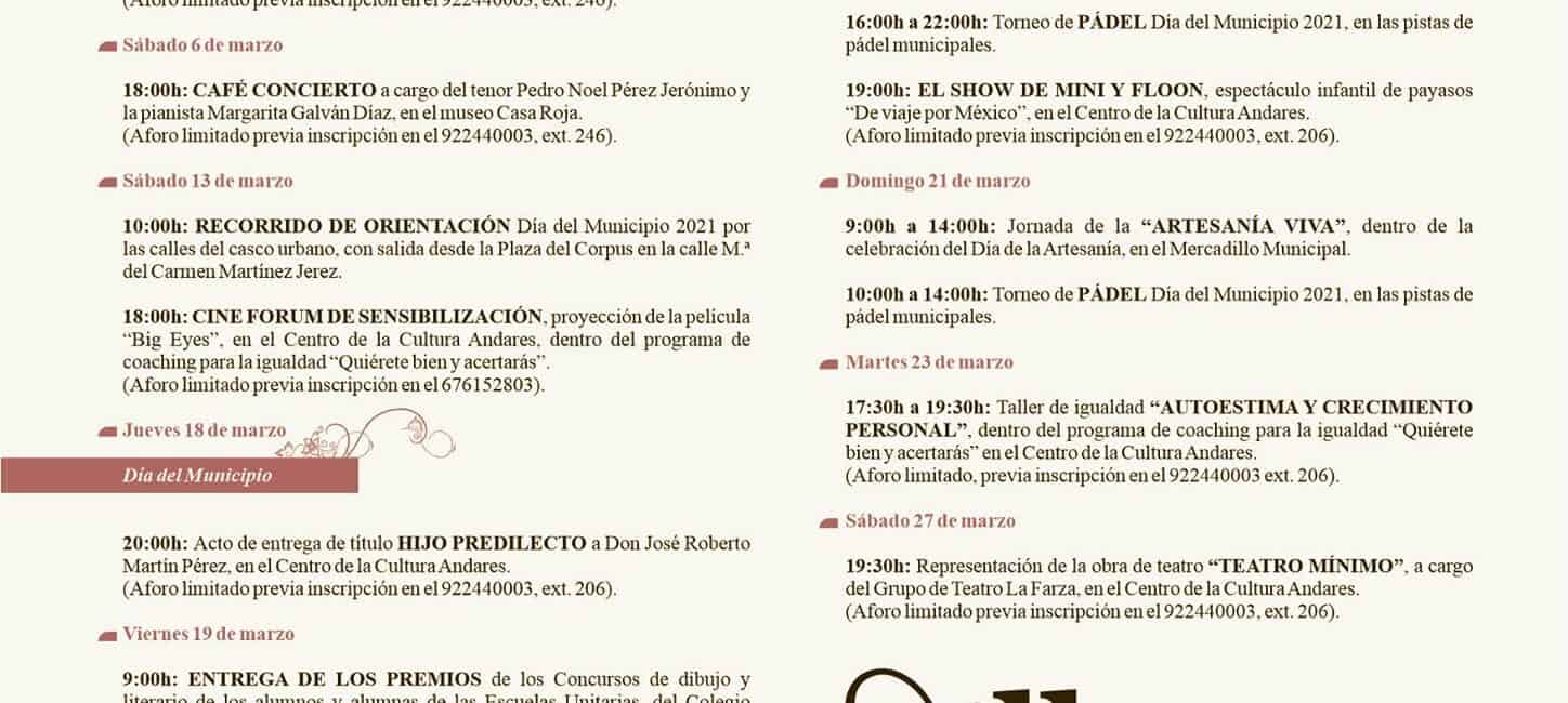 El concejal de Cultura, Omar Fumero, explica que el programa incluye actividades culturales y deportivas dirigidas a todos los públicos, tales como cuentacuentos, café-concierto, jornadas de artesanía, cineforum, pádel y teatro, que se han organizado respetando el protocolo establecido por la Covid-19 y con las que, además, se quiere conmemorar otros días señalados del calendario de marzo, como son el Día Internacional de la Mujer y el Día de la Artesanía.