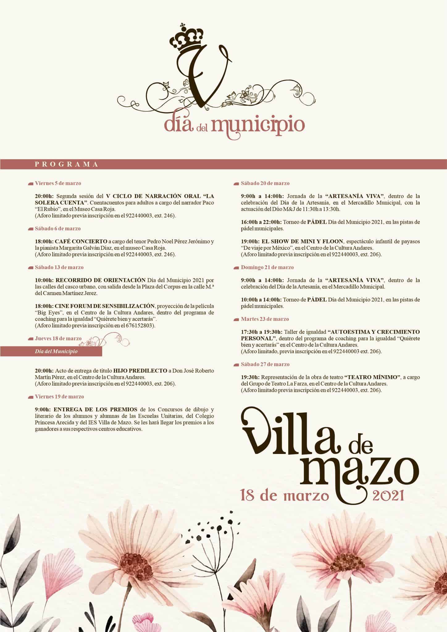 El Ayuntamiento de Villa de Mazo, a través de la Concejalía de Cultura, ha organizado diferentes actos para conmemorar el Día del Municipio 2021 cuya celebración comenzó el pasado viernes día 5 y se prolongará hasta el 27 de este mismo mes.