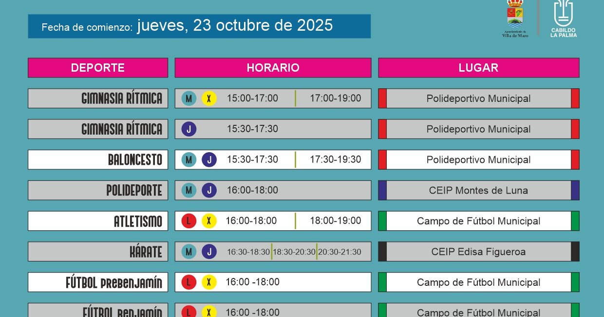 | Lucha Canaria | Lunes y Miércoles | 15:30-17:30 / 17:30-19:30 | Polideportivo Municipal |