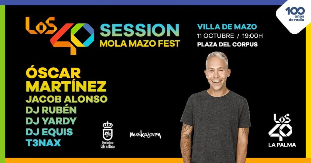 El Ayuntamiento de Villa de Mazo acoge la segunda edición el viernes, 11 de octubre, de ‘Los40 Session Mola Mazo Fest’, que contará con una impresionante alineación de DJs de renombre local a través del promotor Musikajoven.