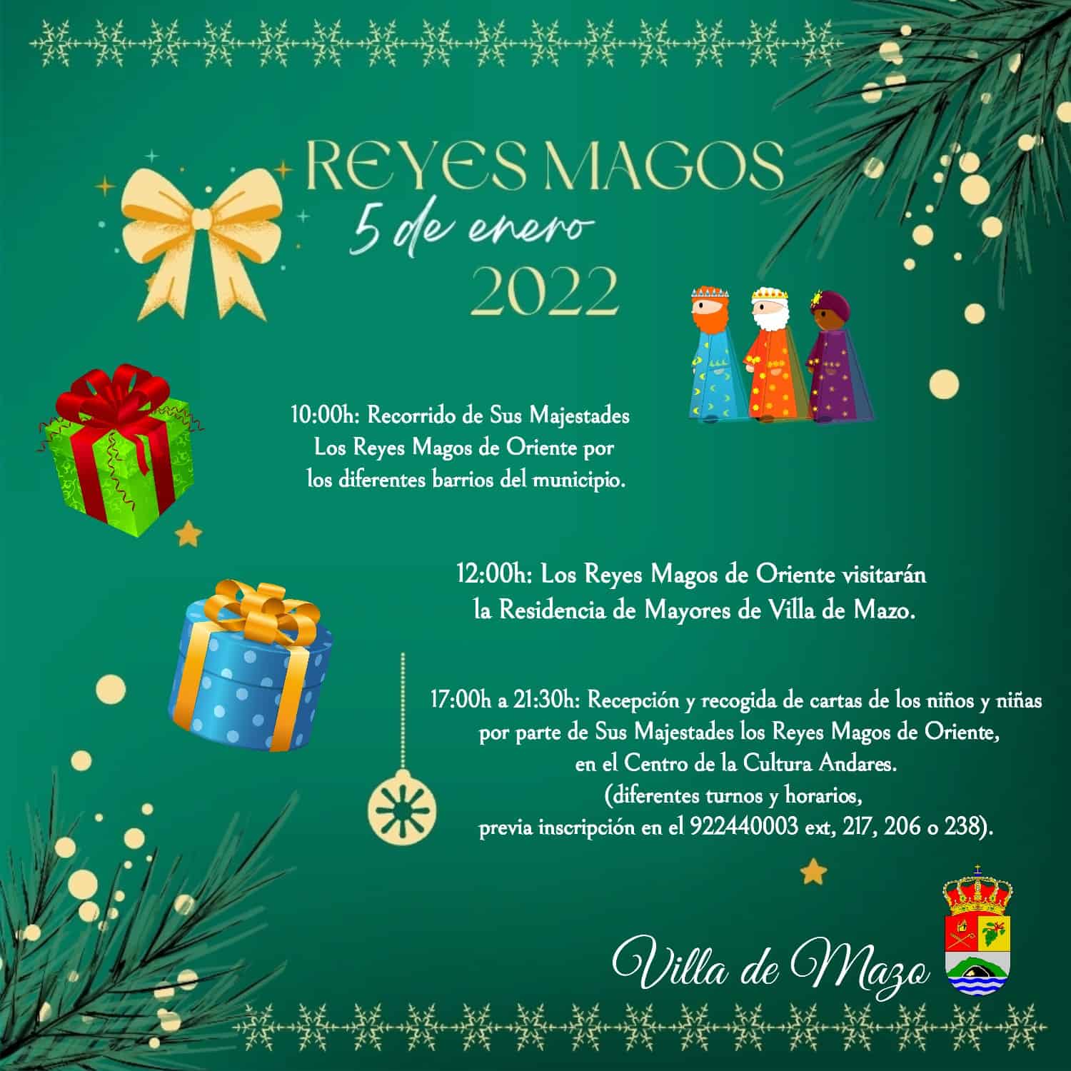 El Ayuntamiento de Villa de Mazo cancela la Cabalgata y el Auto Sacramental de los Reyes Magos de este año debido al aumento de casos por COVID-19. En su lugar, informa que, a partir de las 10:00 horas, Sus Majestades del Oriente recorrerán los barrios del municipio.