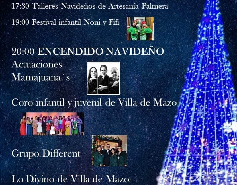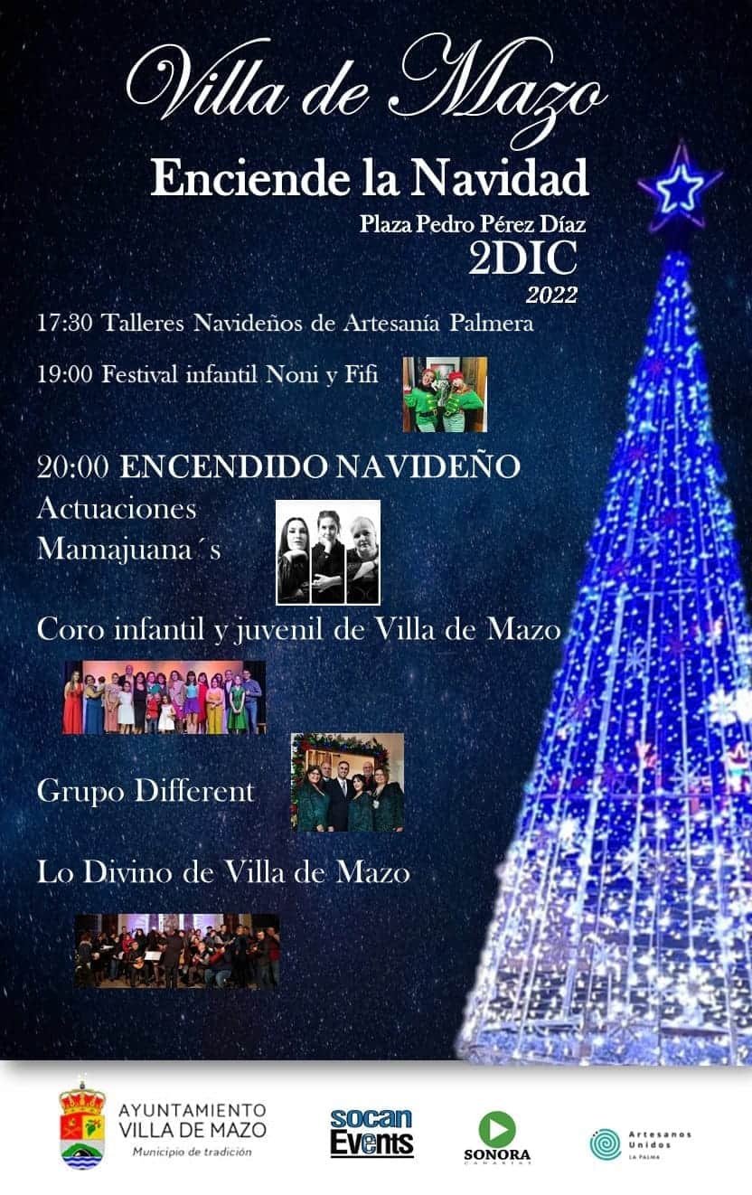 El Ayuntamiento de Villa de Mazo a través de la Concejalía de Fiestas, ha programado el Encendido de Navidad 2022-2023, el viernes día 2 de diciembre de 2022 en la Plaza Pedro Pérez Díaz, a las 20:00h, con las actuaciones musicales del grupo Mamajuana’s, Different, el Coro Infantil y Juvenil de Villa de Mazo y la Rondalla Lo Divino de Villa de Mazo. Dirigido y presentado por May Navarro.