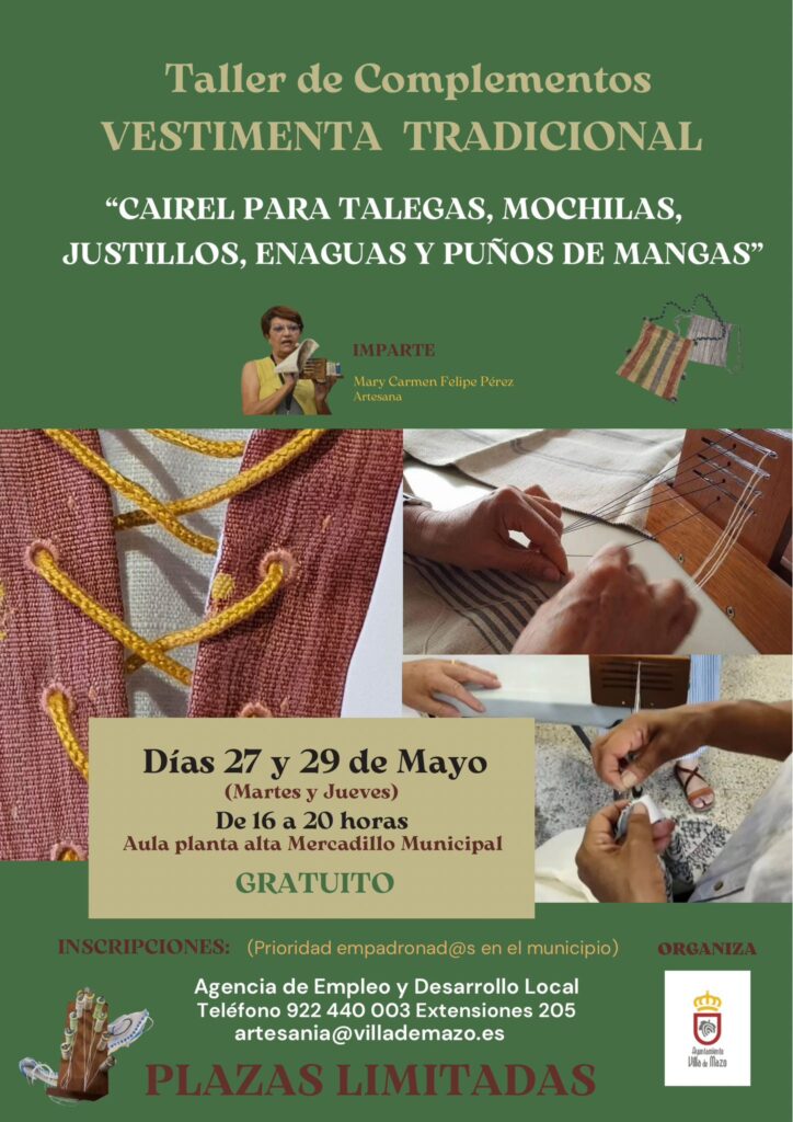 El Ayuntamiento de Villa de Mazo apuesta por la recuperación y preservación del patrimonio cultural del municipio con la celebración del taller ‘Cairel para talegas, mochilas, justillos, enaguas y puños de mangas’, que se impartirá los días 27 y 29 de mayo, en horario de 16:00 a 20:00 horas, en el aula de la planta alta del Mercadillo Municipal.