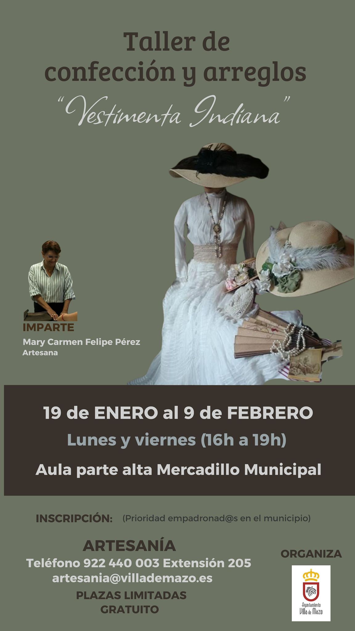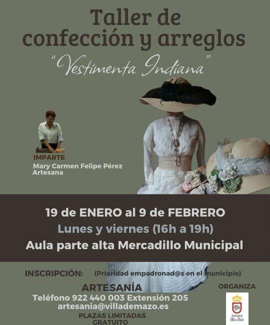 El Ayuntamiento de Villa de Mazo pone en marcha un taller de confección y arreglos centrados en la elaboración de vestimenta indiana, una iniciativa formativa que se desarrollará del 19 de enero al 9 de febrero, los lunes y viernes de 16:00 a 19:00 horas, en el aula de la parte alta del mercadillo municipal.